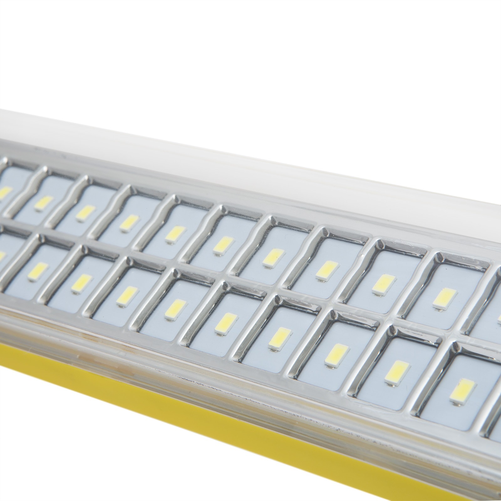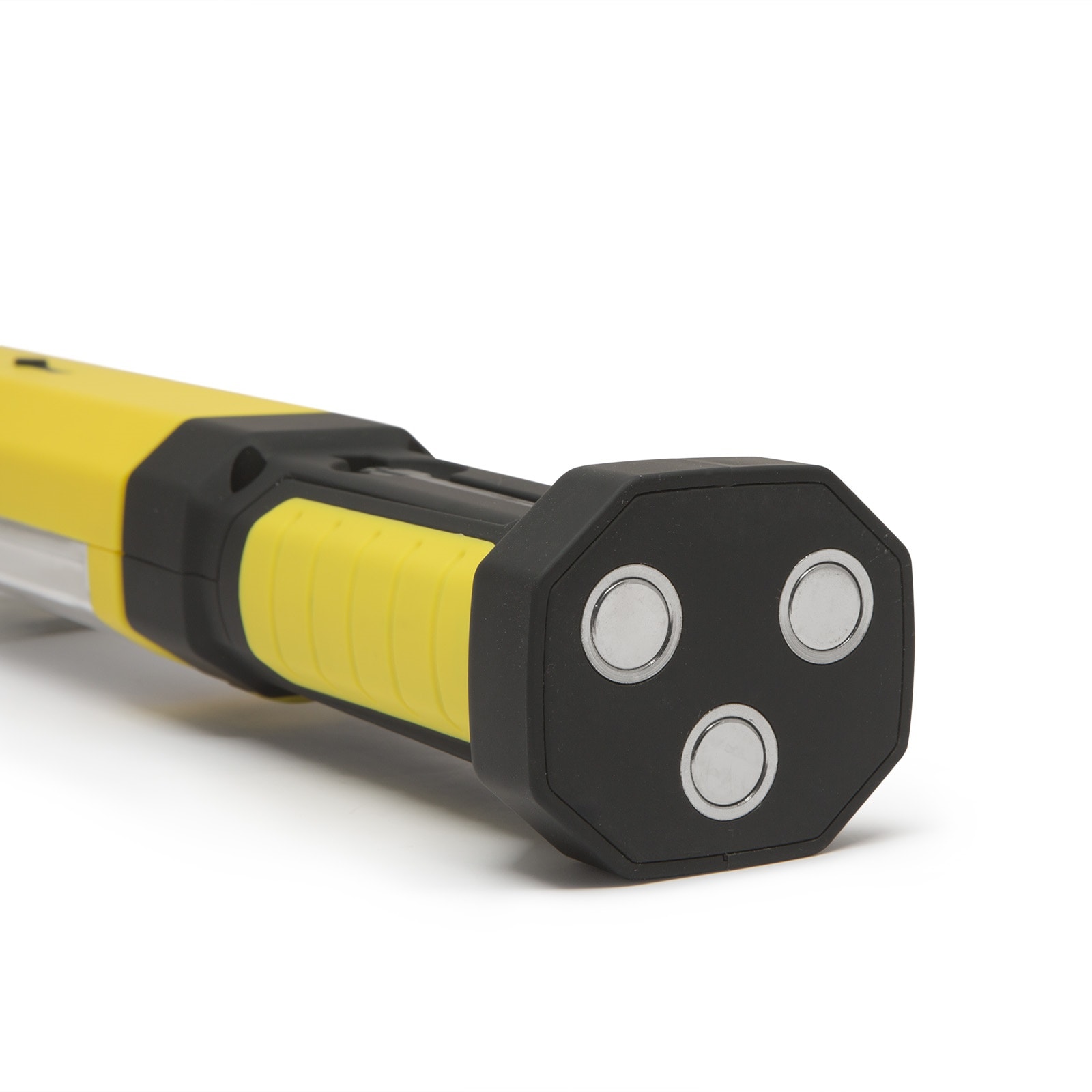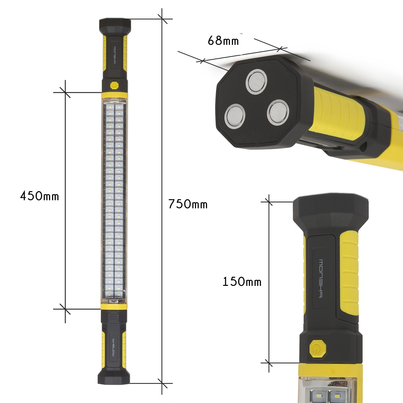 Lineárna nabíjateľná pracovná LED lampa s magnetmi sa napája pomocou zabudovanej 7.2V 2600mAh Li-ion batérie. Vďaka svetelnému toku až 1500lm je skvelým spoločníkom a pomocníkom v boji proti tme. Uchytenie lampy je možné pomocou otočného háčika 360° alebo pomocou otočných magnetov umiestnených oboch stranách lampy. Lampa má dva režimy. Plný výkon s výdržou cca 2 hodiny a nižší výkon s výdržou cca 8 hodín. Doba nabíjania pri plnom vybití 4-5 hodín.