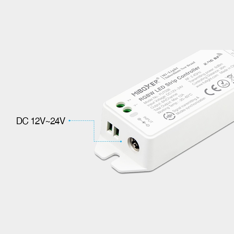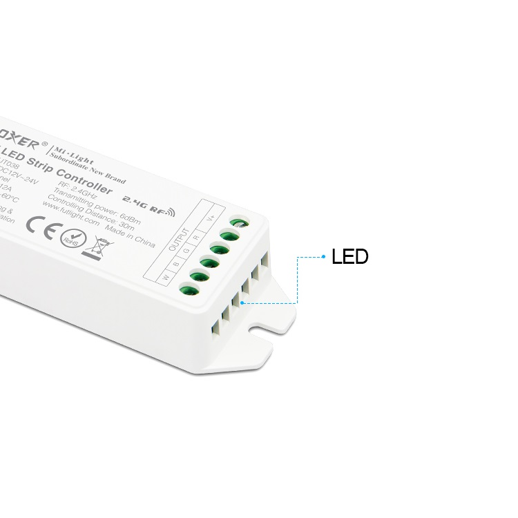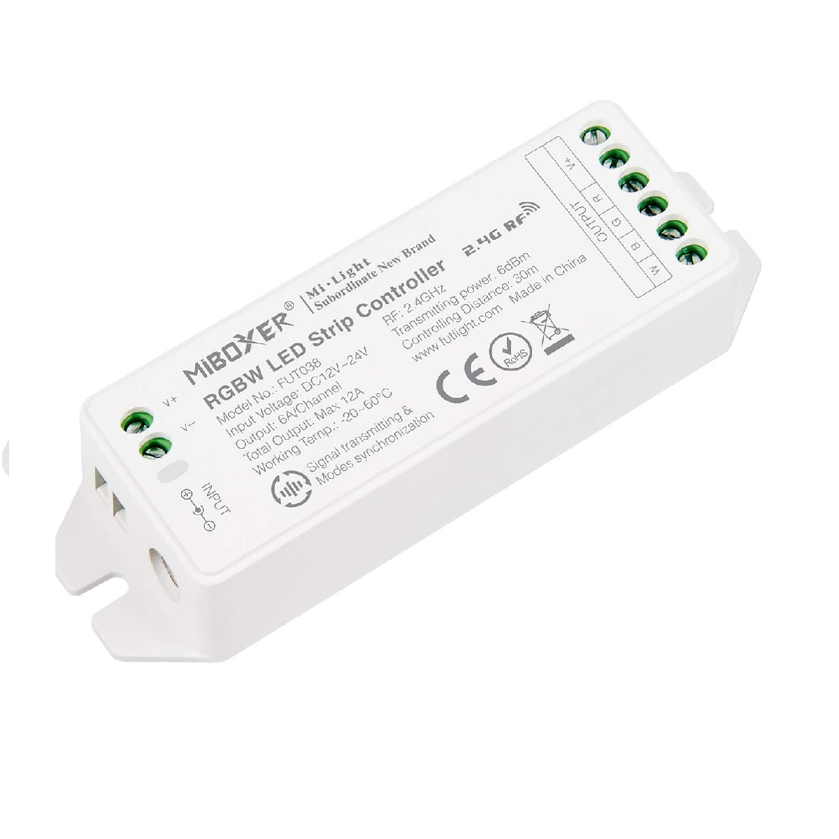 MiLight RF prijímač na ovládanie RGBW LED pásov 12-24V 12A sa používa na ovládanie RGBW LED pásov. Vďaka 2,4GHz technológii je možné pri použití vhodného ovládača napárovať a zosynchronizovať viacero prijímačov na tak zvyšovať celkovú zaťažiteľnosť okruhu. K tomuto prijímaču je možné dokúpiť ovládač do ruky, na stenu 1 kanál aj 4 kanál prípadne wifi modul, vďaka ktorému je možné okruhy ovládať aj cez mobilný telefón. Prijímač má pamäť, takže po výpadku prúdu si pamätá posledné nastavenie.
