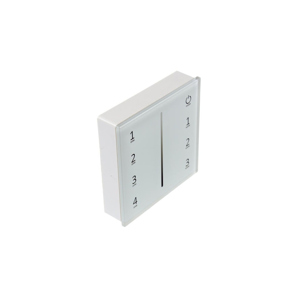 Nástenný RF ovládač na triakový stmievač 4 kanál biely sa používa na stmievanie stmievateľných LED žiaroviek, panelov a svietidiel.
