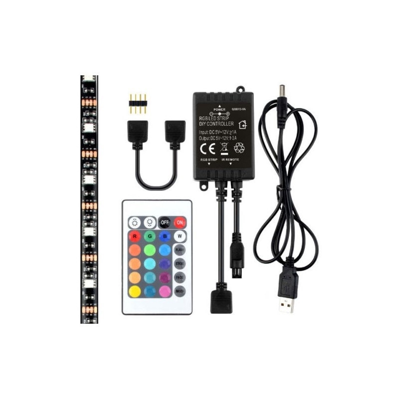 RGB LED sada na osvetlenie televízora 40 – 60″ s USB napájaním slúži na podsvietenie obrazovky televízora, ktorý potom pri sledovaní v tmavej miestnosti znižuje únavu očí z pozerania. Rovnako sa používa aj ako dekoratívne osvetlenie s možnosťou voľby farby svetla. Napájanie je pomocou USB možné priamo z televízora. Pokiaľ je pás použitý inde v domácnosti, je možné ho cez USB napájať buď z powerbanky alebo z klasického adaptéra na 5V používaného na napájanie mobilných telefónov.