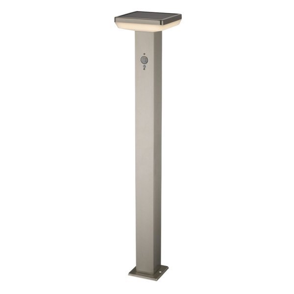Solárny chrómový hranatý LED stĺpik IP44 80cm 4.4W 600lm/60lm so senzorom je svietidlo napájané vstavanou 3,7V 2600mAh batériou, ktorá je dobíjaná slnečnou energiou. Je určený na osvetlenie záhrad, chodníkov či príjazdových ciest a plôch, kde nie je možné priviesť klasický prívod elektrickej energie 230V. Svietidlo sa uchytáva pomocou skrutiek do vhodného materiálu.
