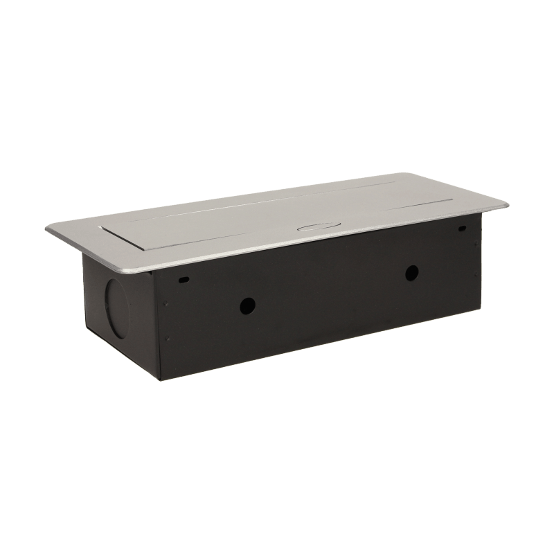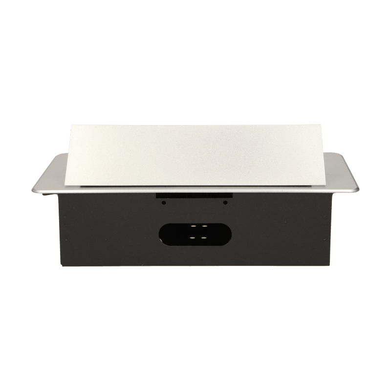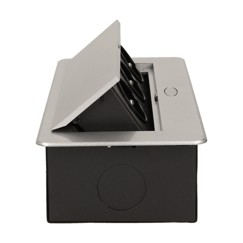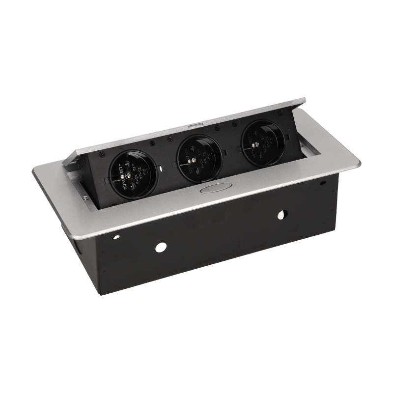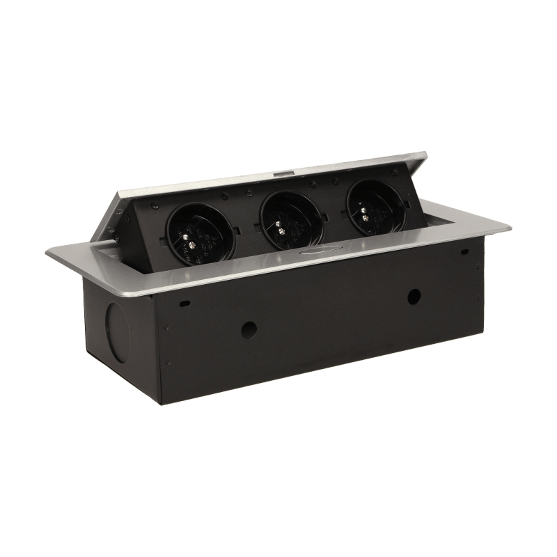 Strieborná výklopná zásuvka do nábytku 3x16A bez kábla je určená na zabudovanie do nábytku, zvyčajne kuchynských liniek, písacích a konferenčných stolov. Môže byť namontovaná vo vertikálnej aj horizontálnej polohe, čo umožňuje dobrý prístup do elektrických zásuviek. Zásuvka obsahuje 3 zásuvky so zemnením a zaťažiteľnosťou 16A.