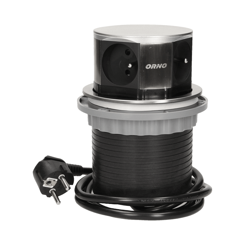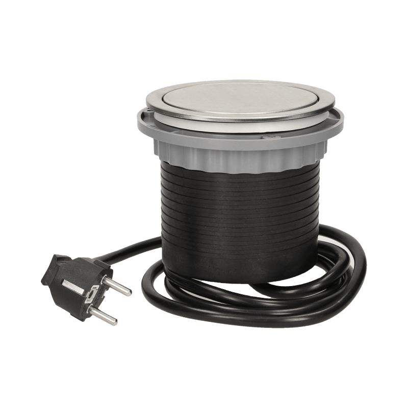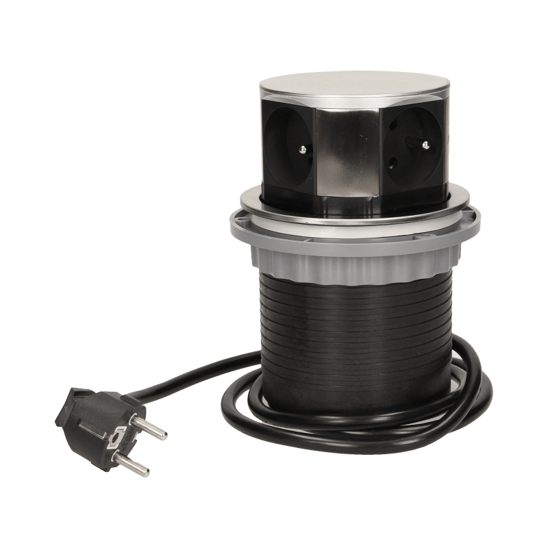 Strieborná výsuvná zásuvka do nábytku 4x16A s flexo káblom je určená na zabudovanie do nábytku, zvyčajne kuchynských liniek, písacích a konferenčných stolov. Môže byť namontovaná vo vertikálnej aj horizontálnej polohe, čo umožňuje dobrý prístup do elektrických zásuviek. Zásuvka obsahuje 4 zásuvky so zemnením a zaťažiteľnosťou 16A.