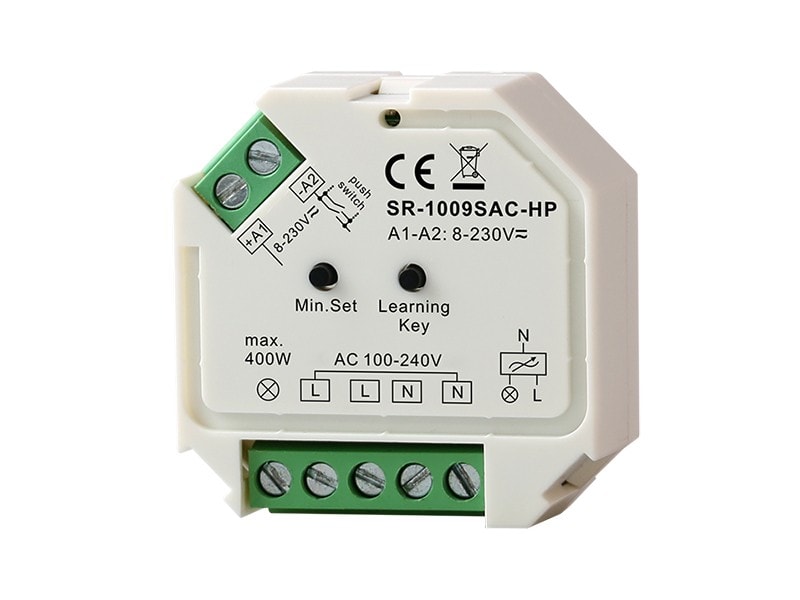 Triakový RF stmievač LED na 230V 400W s možnosťou ovládania tlačidlom sa používa na stmievanie stmievateľných LED žiaroviek, panelov a svietidiel. Vďaka kompaktným rozmerom je možné stmievač umiestniť do klasickej elektrikárskej krabice ako aj ukryť na sadrokartón.