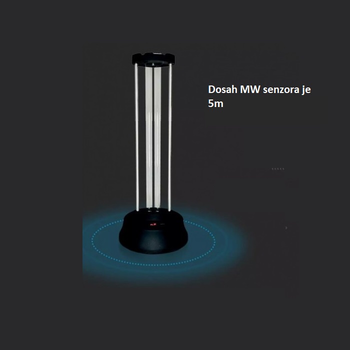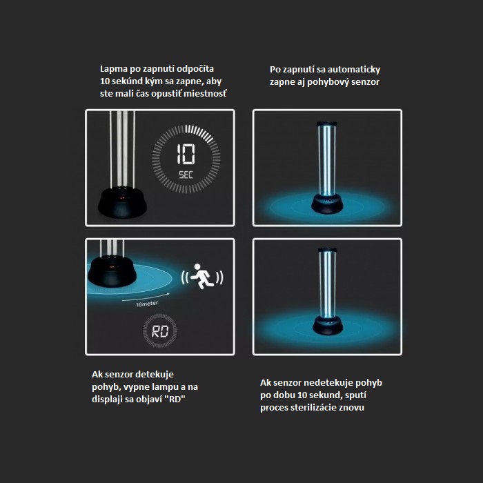 Zároveň je v lampe zabudovaný MW pohybový senzor, ktorý v prípade, že počas dezinfekcie detekuje pohyb vypne lampu, takže ak náhodou omylom vstúpite do dezinfikovaje miestnosti, má Vám čas aby ste ju bezpečne opustili. Po 10 sekundách potom opäť spustí proces dezinfekcie. Po odpočte nastaveného času dezinfekcia sa lampa automaticky vypne.
