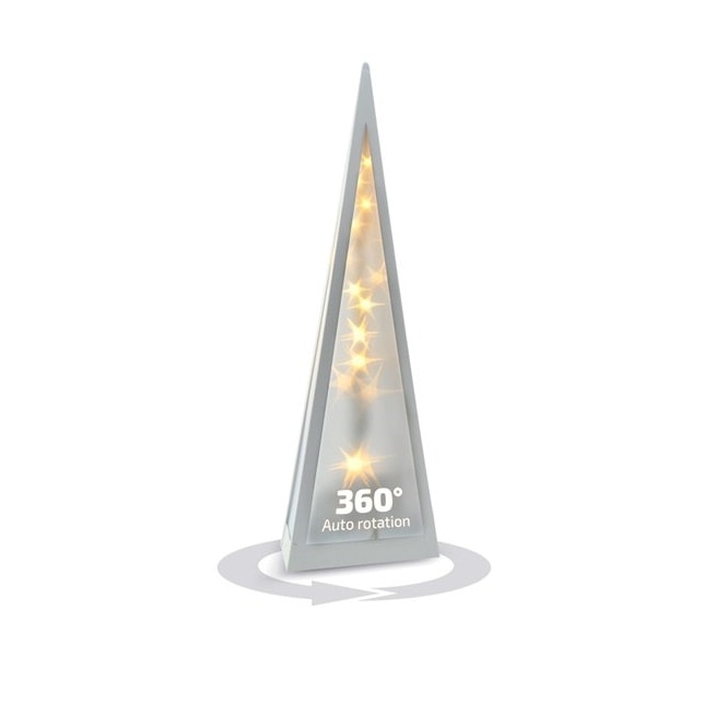 Vianočná LED pyramída s 3D efektom hviezd na 230V sa vďaka modernému dizajnu hodí vianočná dekorácia do každej domácnosti či reštaurácie. Lampa sa zapína vypínačom na spodnej strane. Zabudovaný motorček a funkcia otáčania.