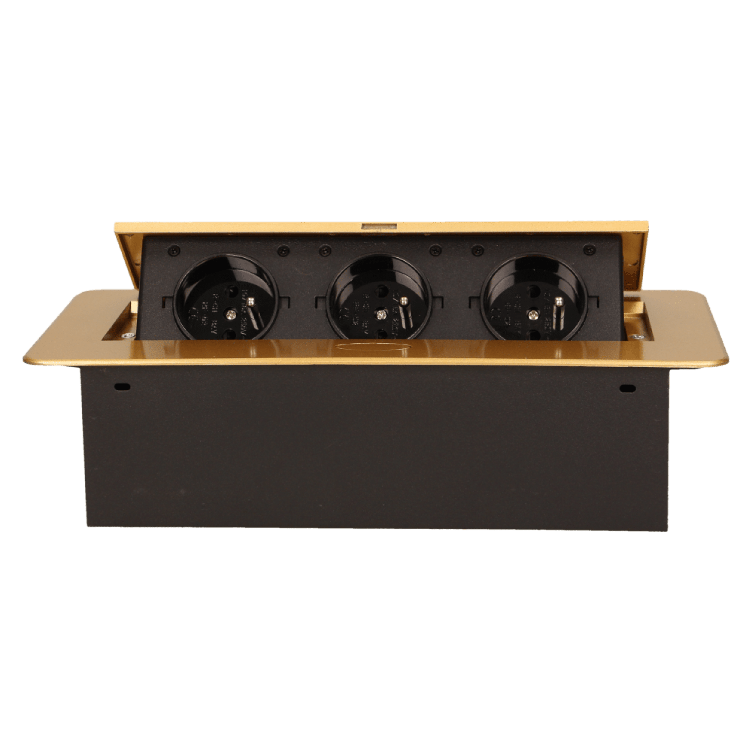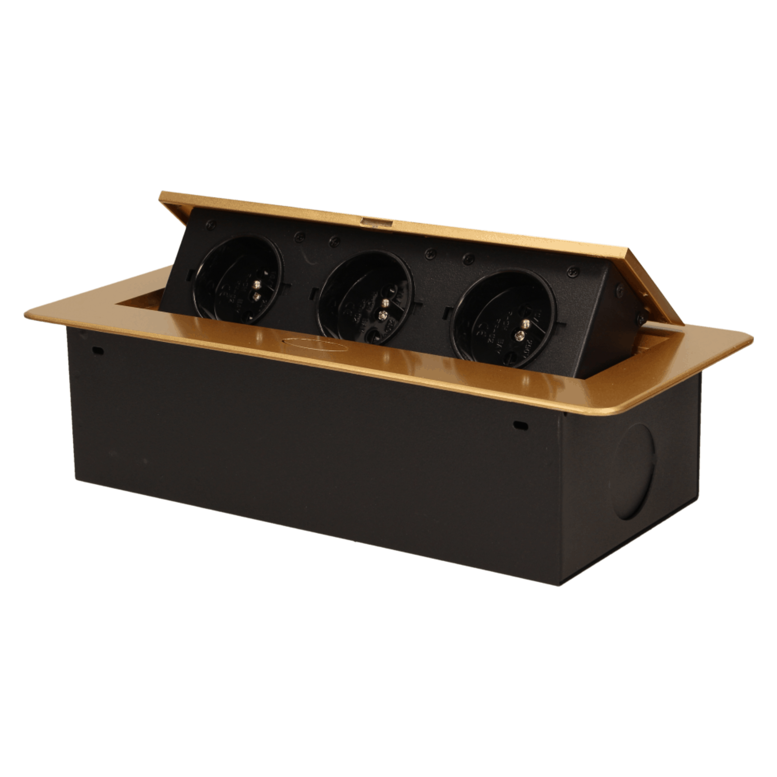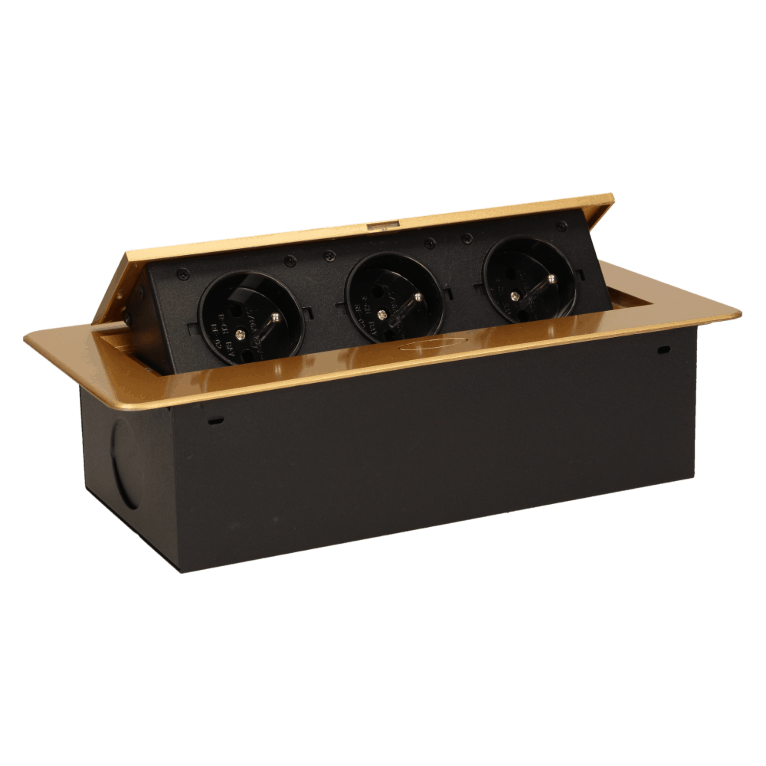 Zlatá výklopná zásuvka do nábytku 3x16A bez kábla je určená na zabudovanie do nábytku, zvyčajne kuchynských liniek, písacích a konferenčných stolov. Môže byť namontovaná vo vertikálnej aj horizontálnej polohe, čo umožňuje dobrý prístup do elektrických zásuviek. Zásuvka obsahuje 3 zásuvky so zemnením a zaťažiteľnosťou 16A.